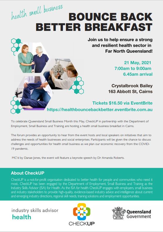 If you are in Far North Queensland and have an interest in health business or social enterprise, you might be keen to attend next week’s Bounce Back Better Breakfast. This event is supported by the Queensland Government and CheckUP. Registrations are via Eventbrite: https://www.eventbrite.com.au/e/bounce-back-better-health-breakfast-tickets-152461563641