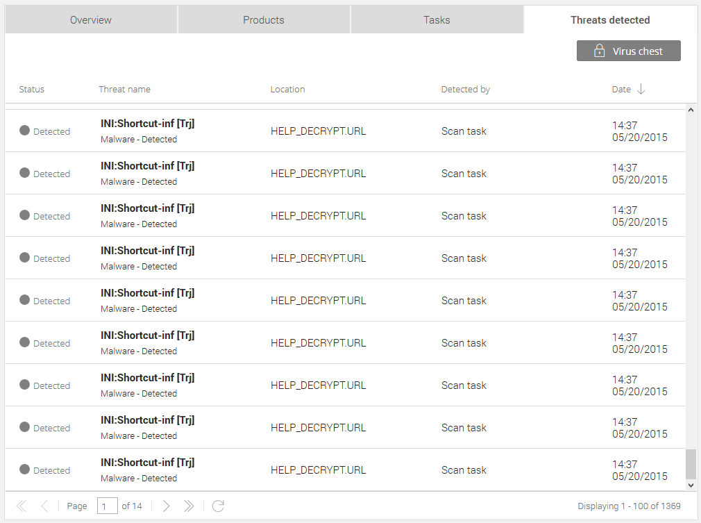 First thing I do when I arrive on scene is unplug the network cable and switch on the server to run a full scan. You can see how many files it had encrypted in the image below. That was after I deleted a stack of them. Be sure to note the bottom of the screenshot. There’s 14 pages of this with each page showing 100 items. All up it had encrypted approximately 16000 (sixteen thousand) files consisting of PDF, JPG, DOCX, XLSX… you get the picture and it wasn’t even finished. It stopped when the server was shut down.
